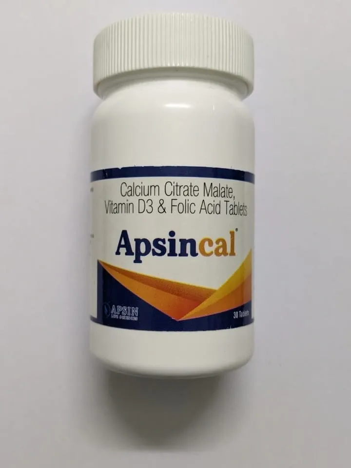Apsincal is a calcium supplement with vitamin D3 and folic acid. It has calcium citrate malate, the most absorbable calcium.