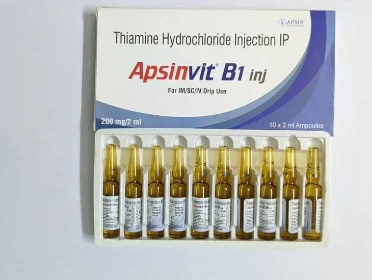 Apsinvit B1 injection is a thiamin supplement for treating thiamin deficiency in alcoholics and malnourished individuals.