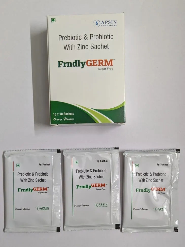 Frndlygerm is a pre- and probiotic sachet with multi-beneficial bacteria, prebiotic fructooligosaccharide, and zinc for gut health.